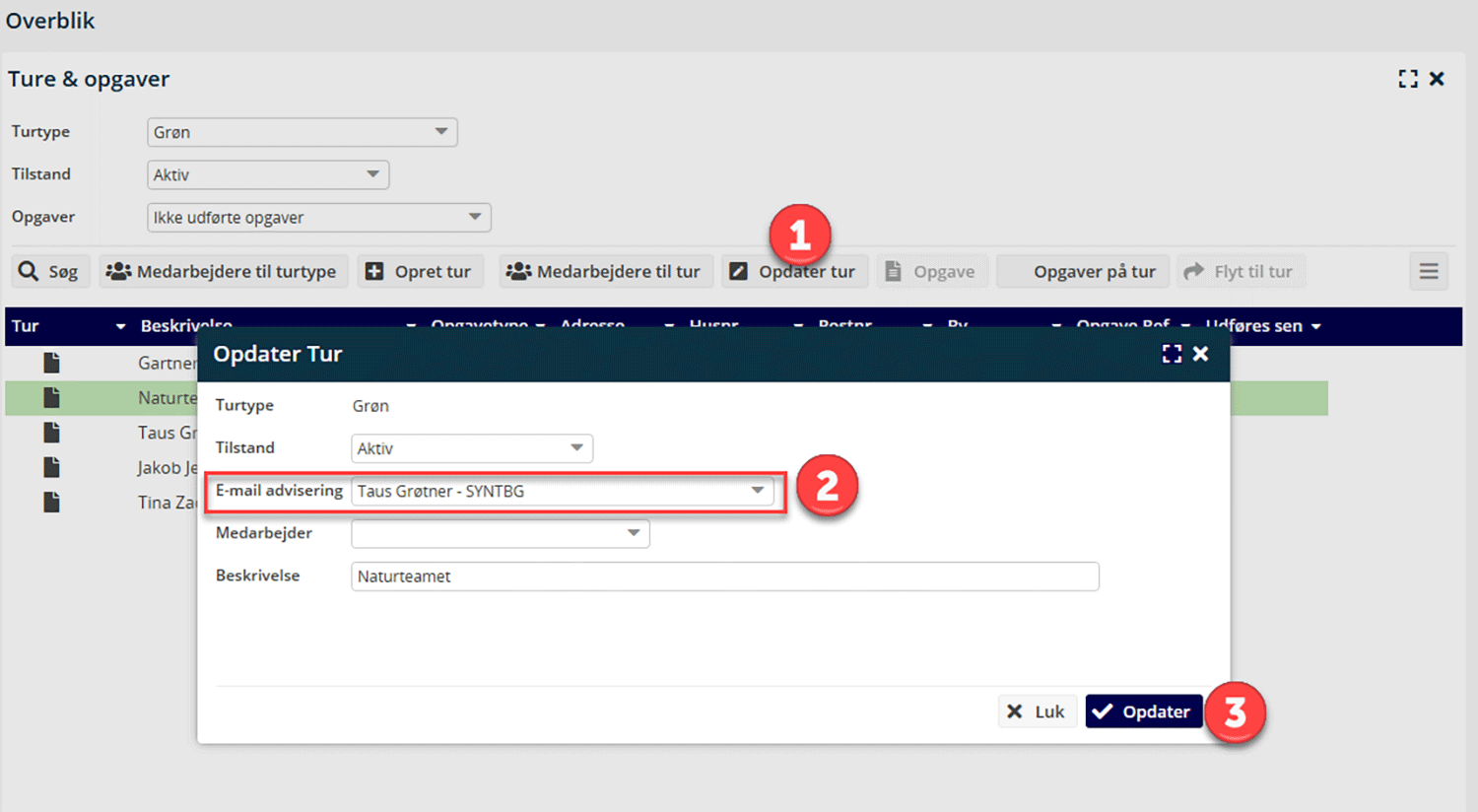 - Gå til ”Opdater Tur” og vælg den medarbejder, der skal modtage adviseringen, i feltet “E-mail advisering”